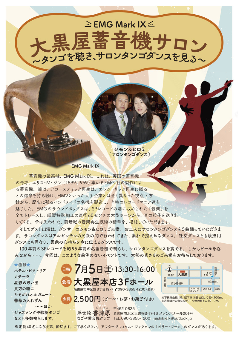 100年前のSPレコードを約95年前の名蓄音機 EMG Mark IXで鳴らし、シモン&ヒロミによるサロンタンゴダンスを賞でる。